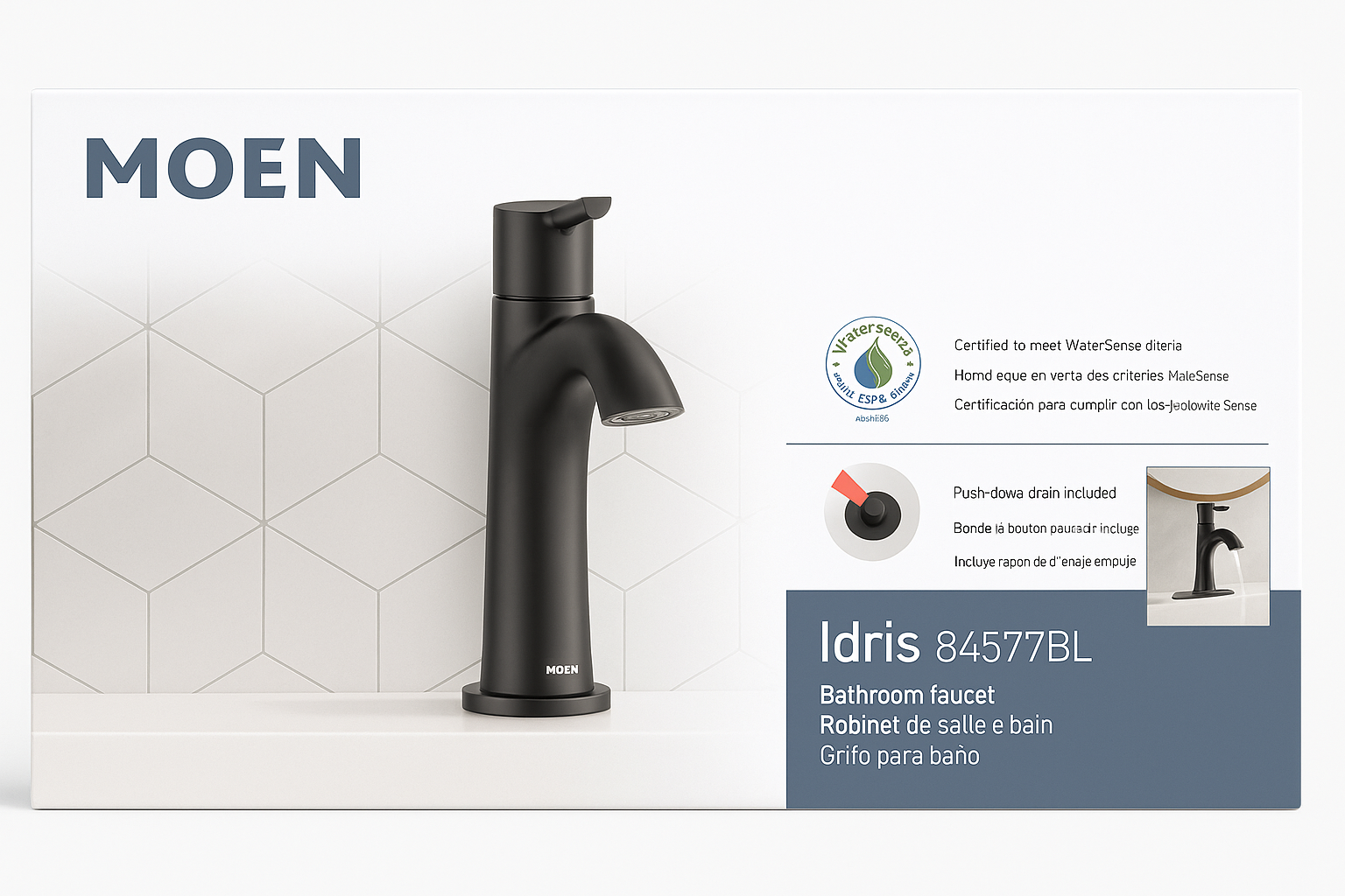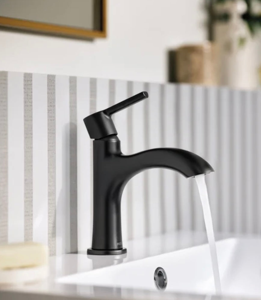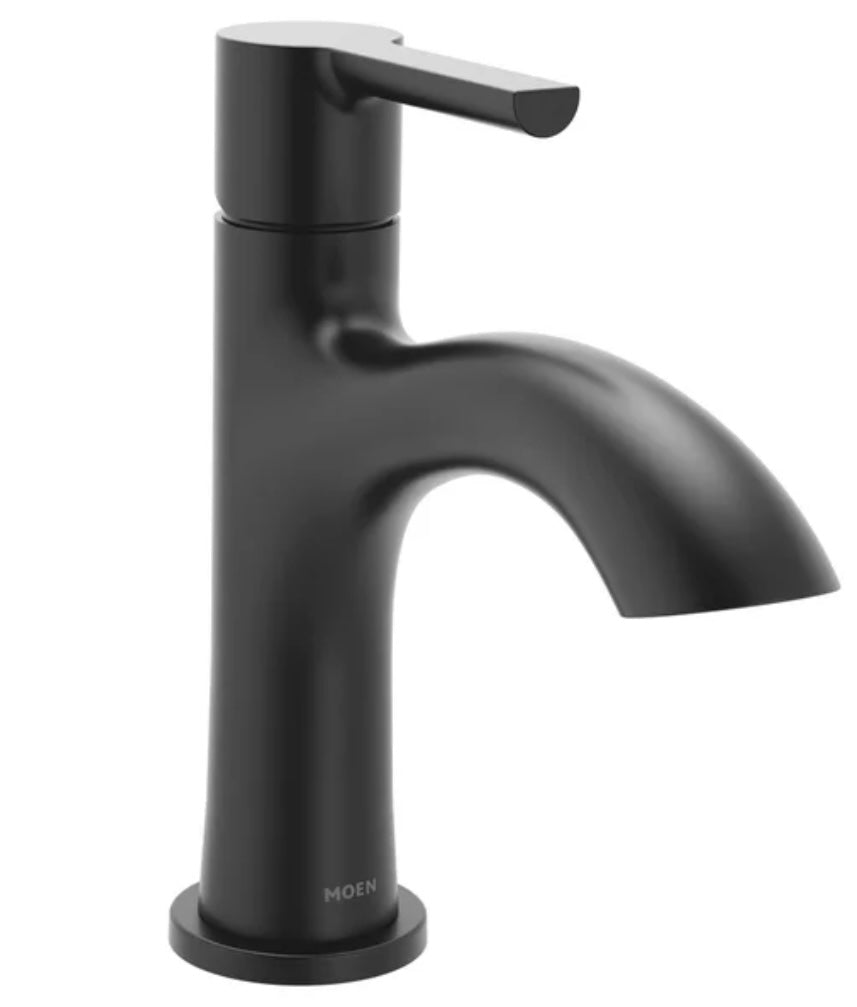 Grifo para lavabo de baño Moen Idris 84577BL en acabado negro mate, con diseño moderno y elegante. Ideal para dar un toque sofisticado a tu baño con la calidad Premium de Moen