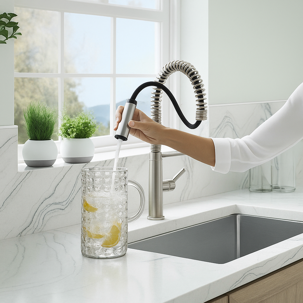 Dale un estilo moderno y funcional a tu cocina con esta mezcladora monomando tipo chef.